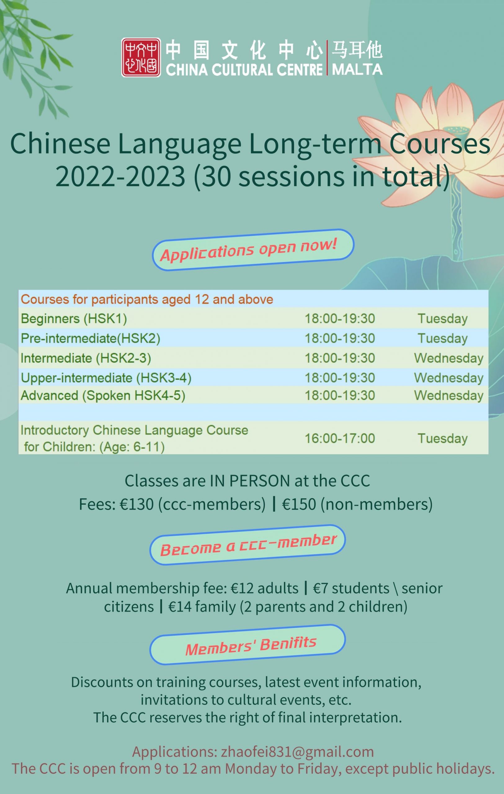 Welcome to Chinese language courses 2022-2023 at the China Cultural Centre in Malta ! Maltaccc | August 31, 2022 Applications for Chinese language courses for the 2022-2023 academic year are now open at the China ...