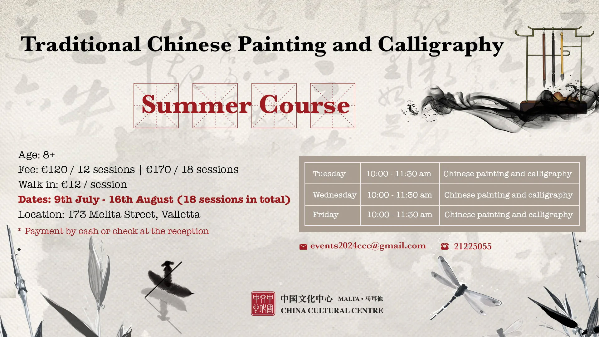 【活动预告】马耳他中国文化中心书法暑期班(2024.7.9-8.16) Maltaccc | 2024年6月24日 书法是中国独有的文字美的艺术表现形式,历经数千年的发展,已成为中国传统文化的重要组成部分。书法不仅是书写的艺术,更是修身养性、陶冶情操的重要途径。中国传统绘画,又称“中国画”或“国画”,历史悠久,最早...